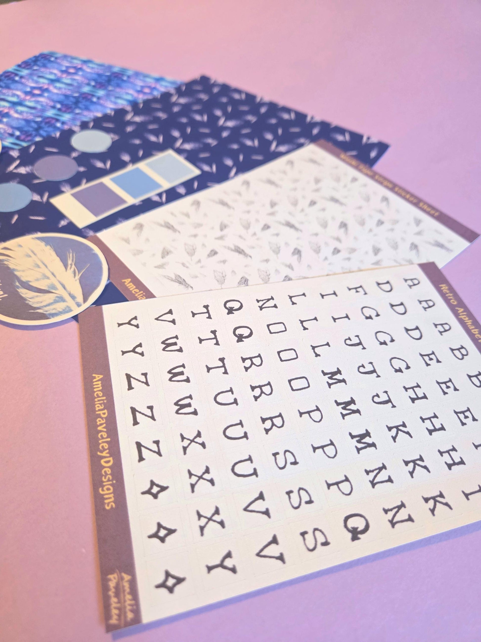 Designed and illustrated by Amelia Paveley, this kit features dreamy blue tones, feather illustrations, wolf-inspired details and coordinating papers and stickers — all carefully selected to work perfectly together.