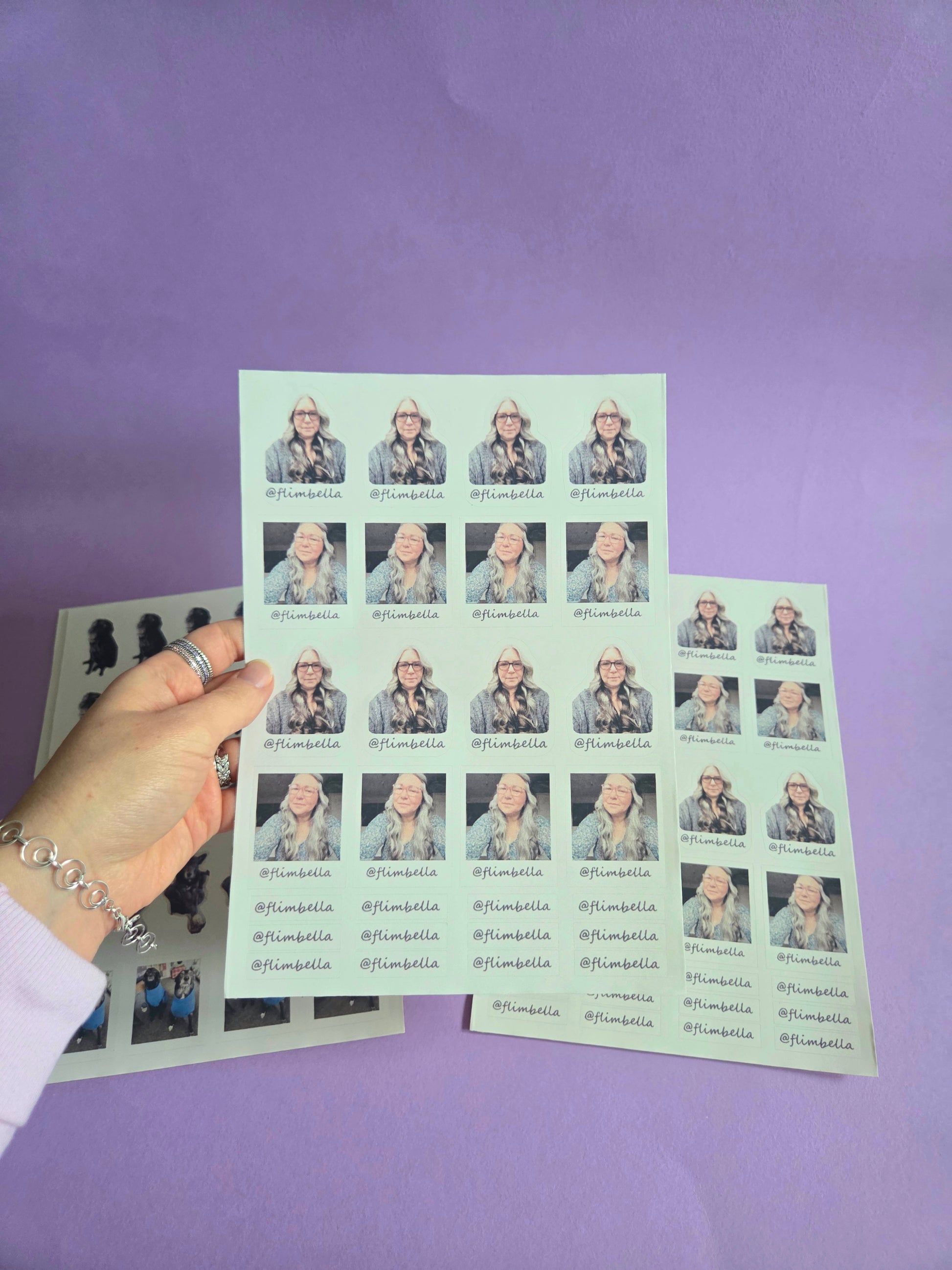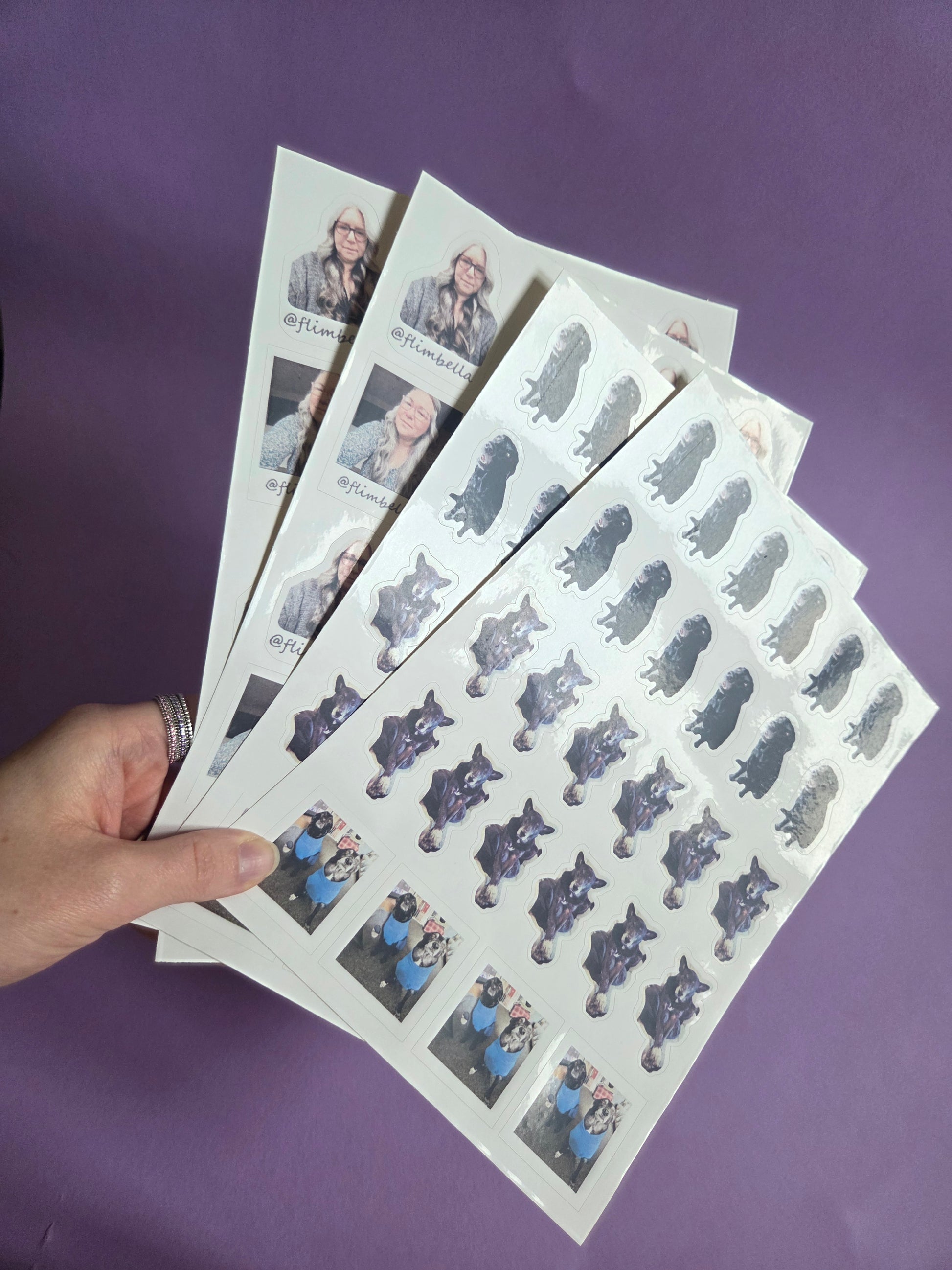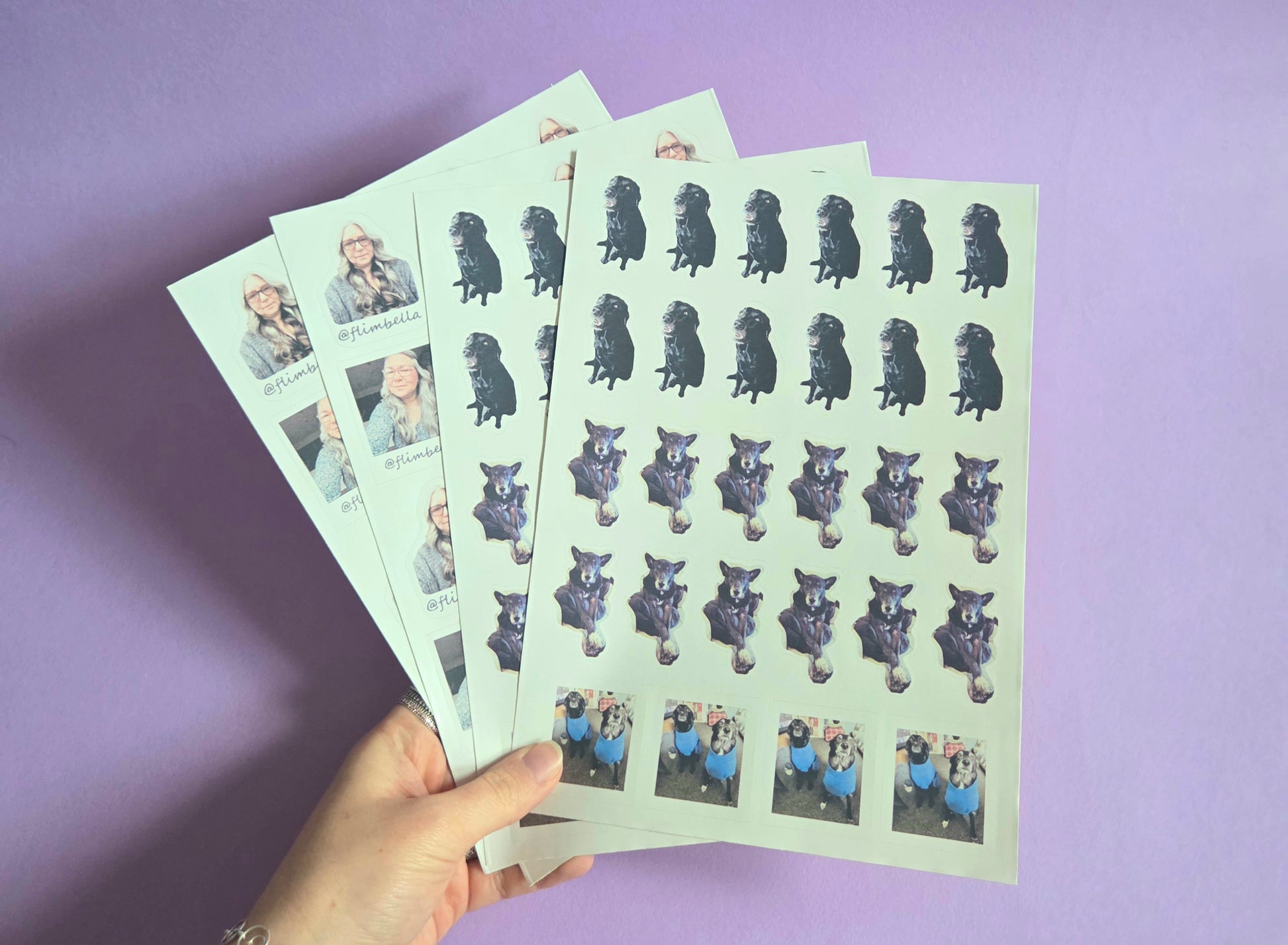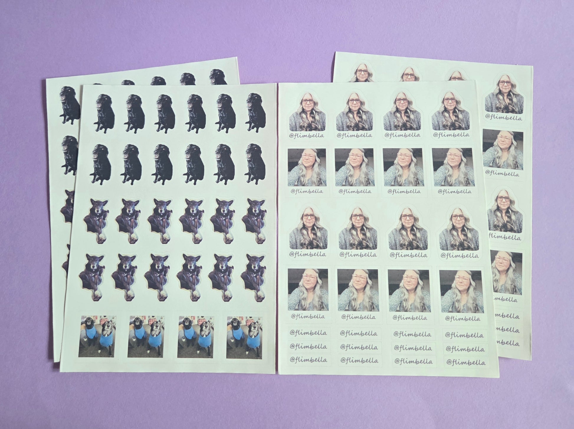 X4 slightly smaller than A4 glossy sticker sheets with your face, @flimbella tag and your 2 beautiful dogs 🐕🐕 as kiss cut stickers (as confirmed previously)