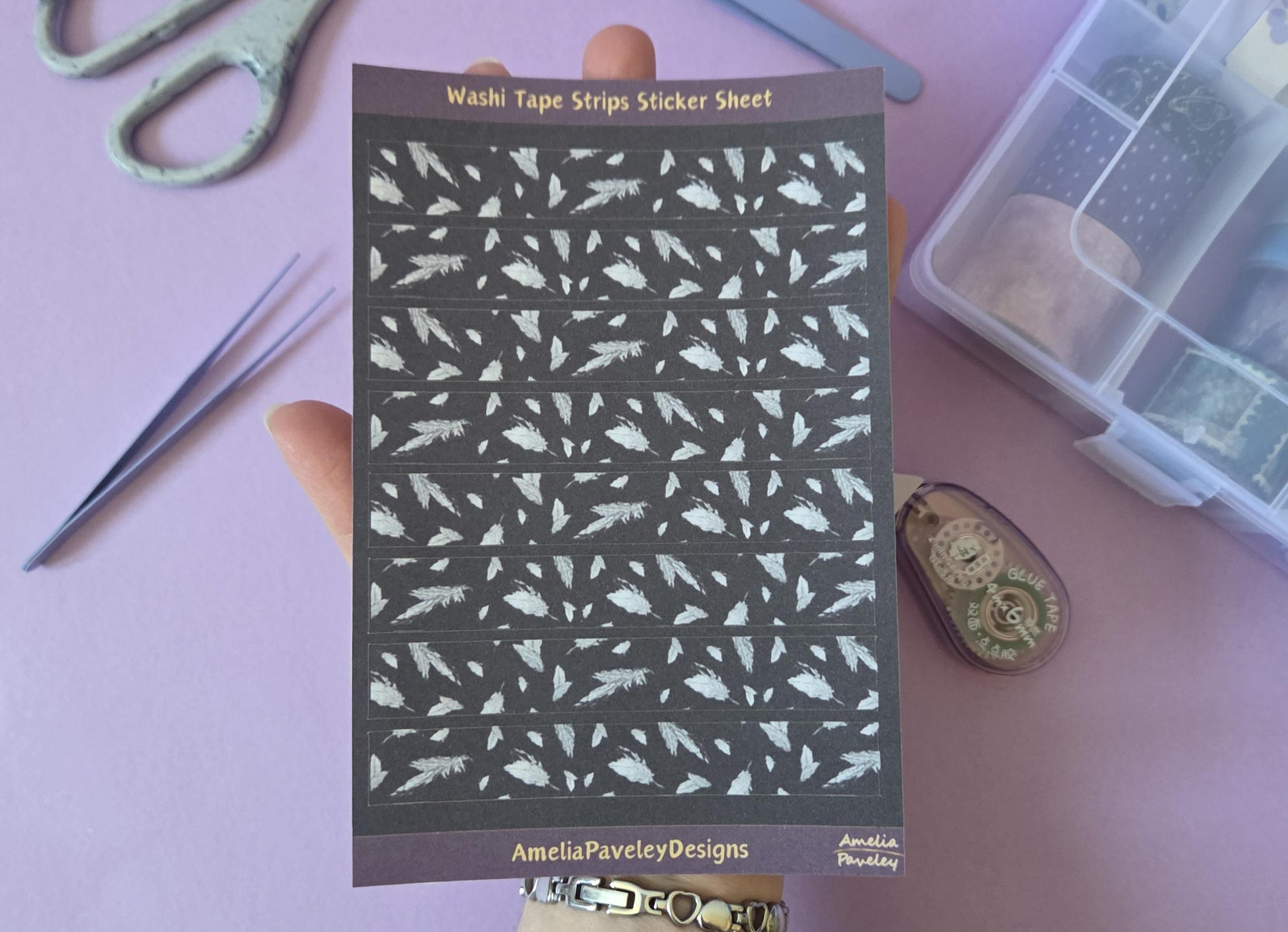 Feathers Dark Dreamy Washi Tape Pattern Strips Sticker Sheet, Feather pattern, junk journal stickers, ethereal journal