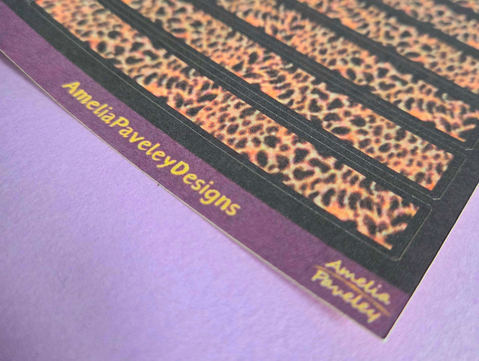The sheet includes multiple strip lengths, so you can layer, divide sections, outline photos, or simply add a pop of wild energy to your creative pages. Printed on smooth matte sticker paper that blends beautifully into your journaling backgrounds — just like washi tape, but without the bulk of a roll. Instead all on a sticker sheet slightly smaller than A5.
