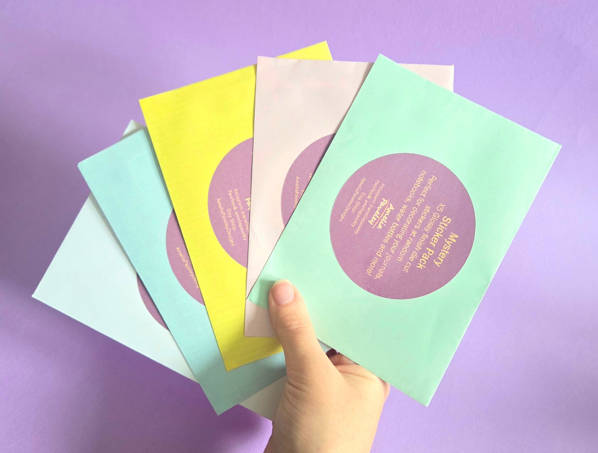Each pastel envelope is filled with a handpicked mix of cute, high-quality stickers — perfect for journals, planners, scrapbooks, and creative projects. Every pack is a mystery, featuring a fun assortment of designs from across Amelia’s collections, including cozy doodles, plants, quotes, and more.