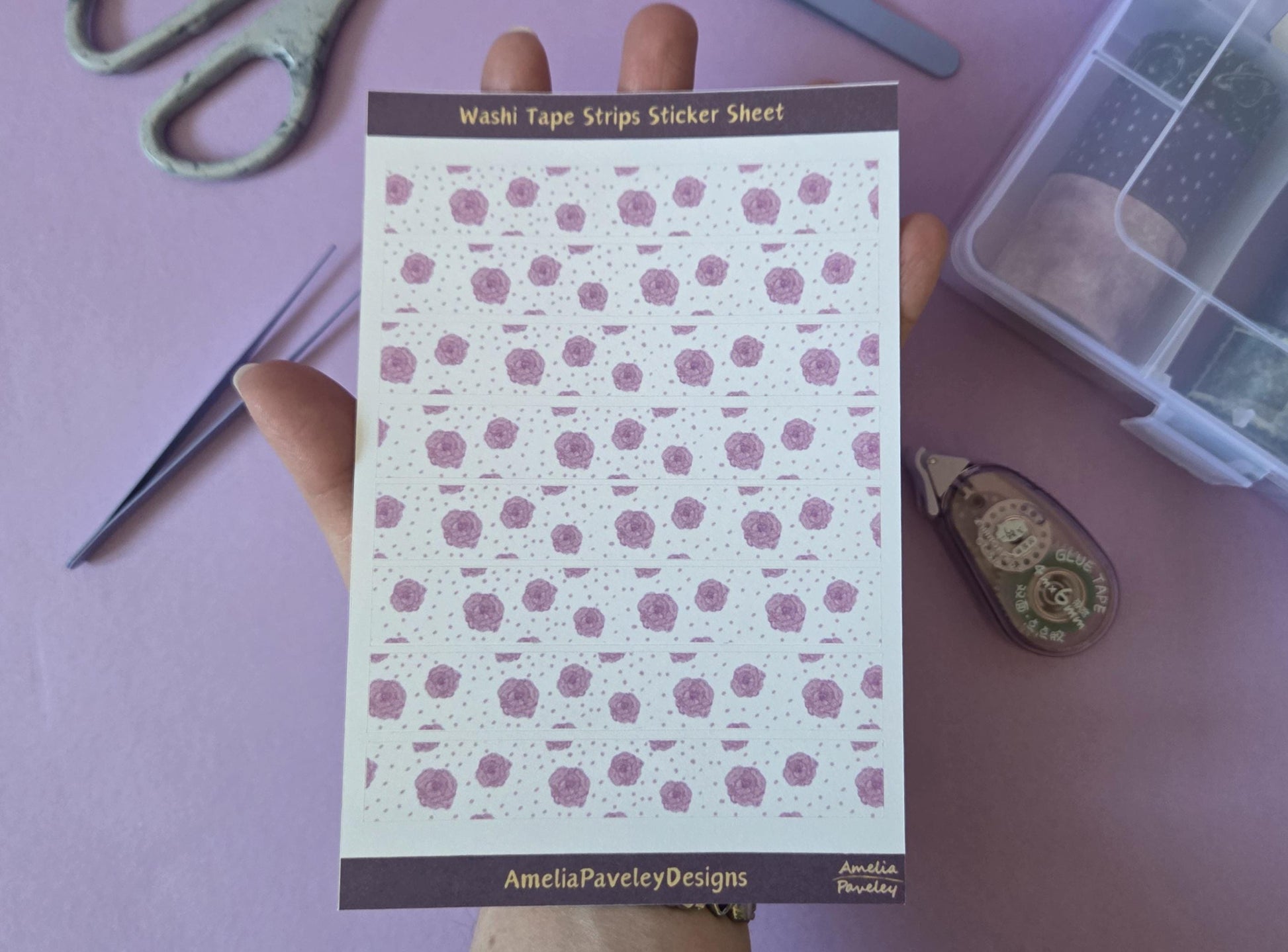 Cute delicate pink roses dotty washi tape pattern strips sticker sheet, inspired by the roses in my Mums garden!