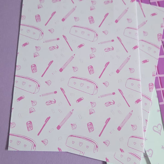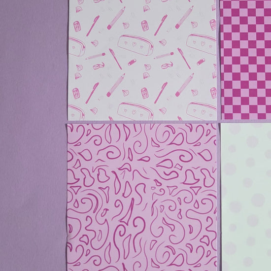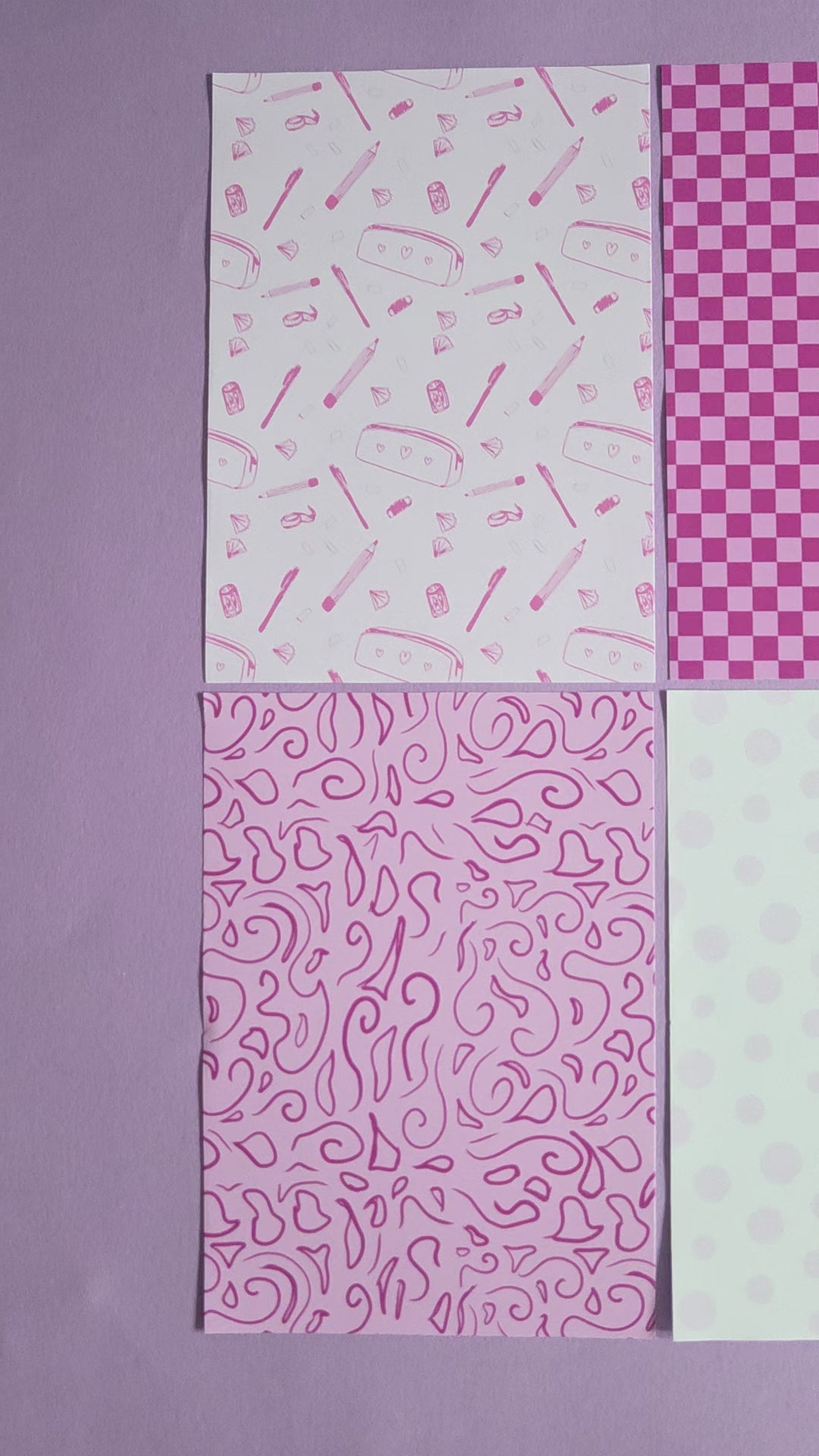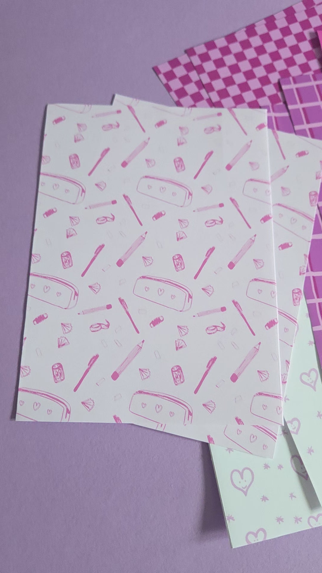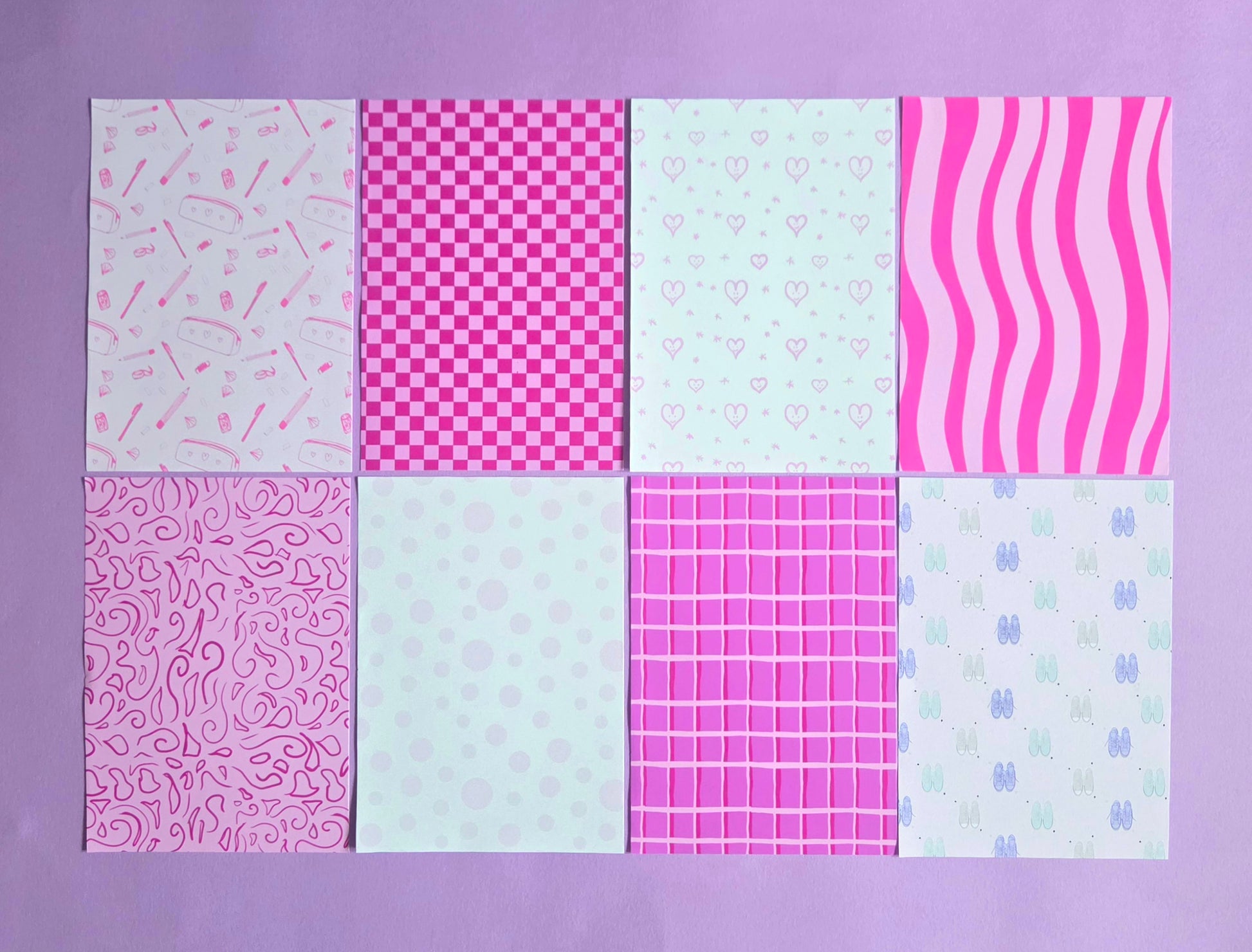 Each sheet features a different illustrated pattern, from a mix of cute, bold and aesthetic pink patterns—checkered, stripes, squiggles, hearts, dots and hand-drawn illustrated motifs—this pack gives you a beautiful variety of textures and styles to elevate your crafting. The papers are ideal for junk journal double-page spreads, scrapbook layouts, collage art, cardmaking, and pen pal letters.