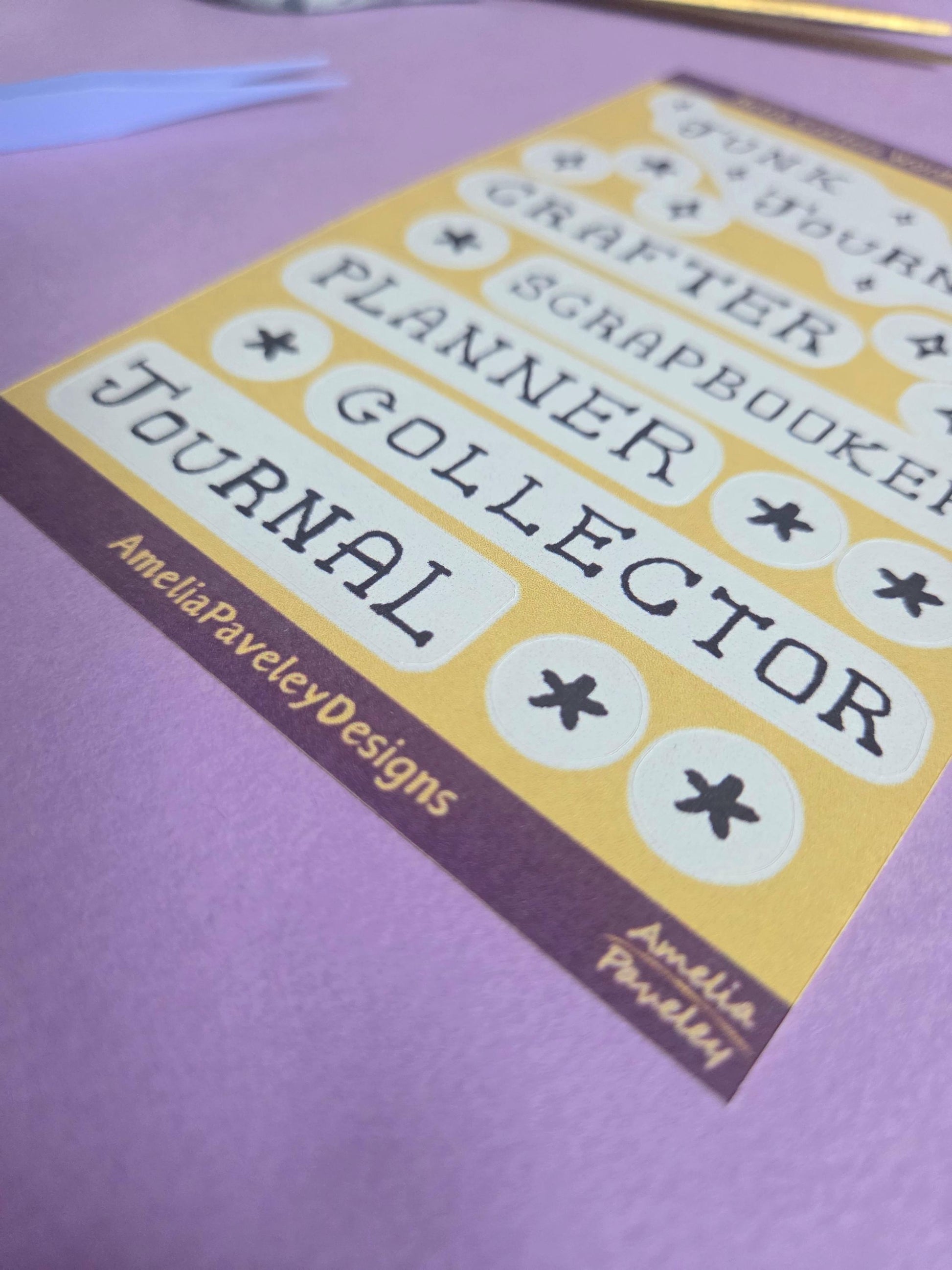 With a mix of popular crafting terms and expressive labels, this sticker sheet is perfect for makers, journalers and anyone who loves adding themed accents to their spreads. The sheet is slightly smaller than A5, making it easy to store in planner pockets or tuck into your journaling kit.