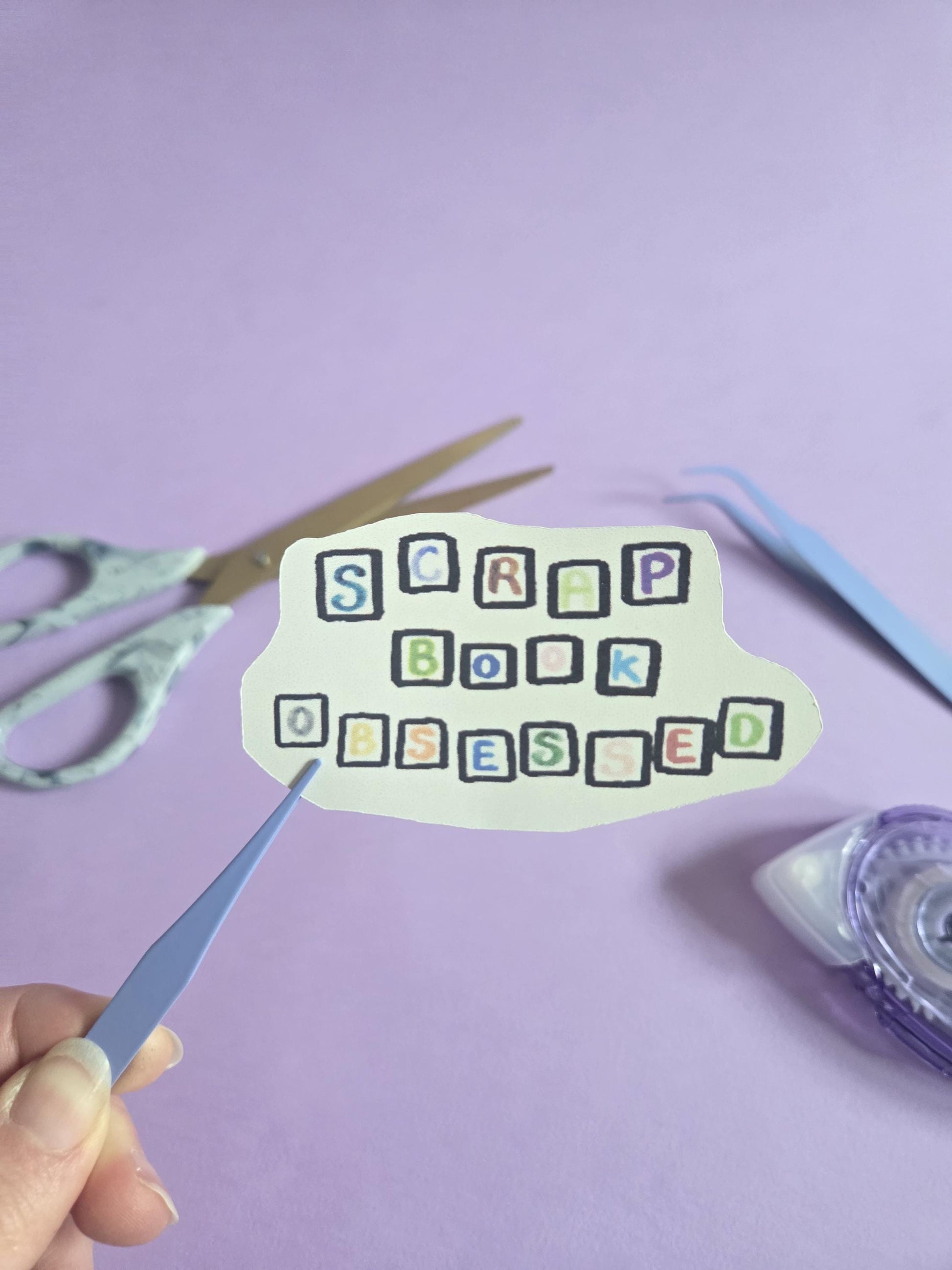 Show off your love for scrapbooking with this bold and colourful “Scrapbook Obsessed” ransom-letter style sticker! Each letter is hand-drawn in a playful collage style, featuring mixed colours, quirky shapes and bold black outlines — just like classic cut-out ransom lettering.