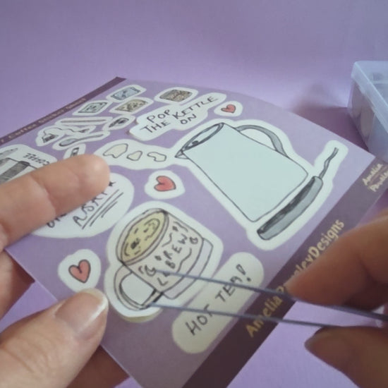 Each sticker sheet is filled with hand-drawn illustrations of tea mugs, coffee cups, kettles, and warm beverage essentials β plus cute phrases like βPop the kettle onβ and βPut a brew on ASAP.β Perfect for tea lovers, coffee drinkers, and stationery collectors alike.
