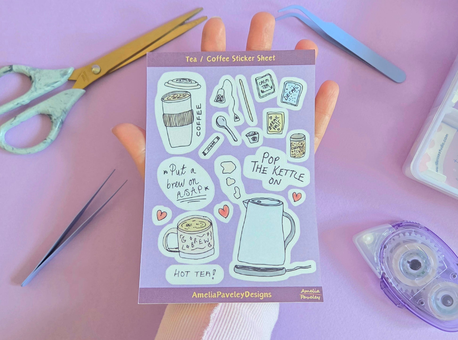 Bring a cozy cuppa vibe to your journal, planner, or laptop with this Tea and Coffee Sticker Sheet by Amelia Paveley! βπ