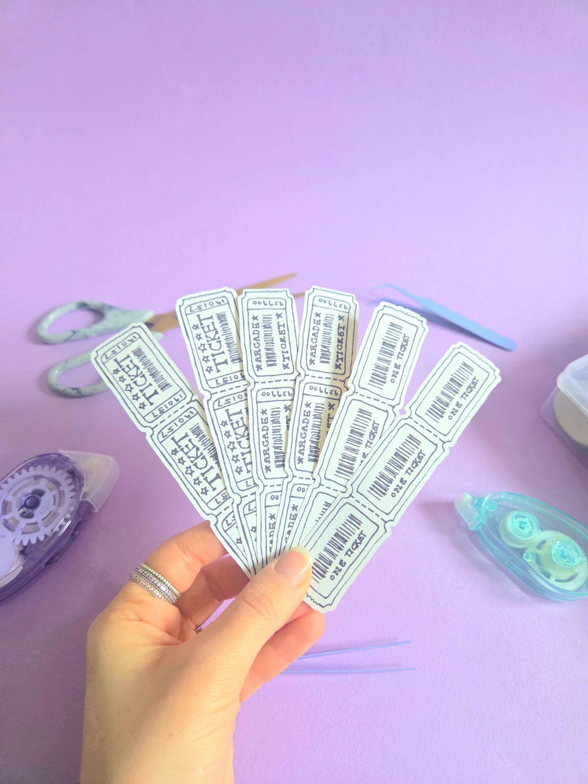 Add nostalgic charm to your crafts with this set of 6 retro-style ticket strip stickers. Designed to look like vintage arcade and event tickets, these stickers bring a fun, old-school feel to any creative project.