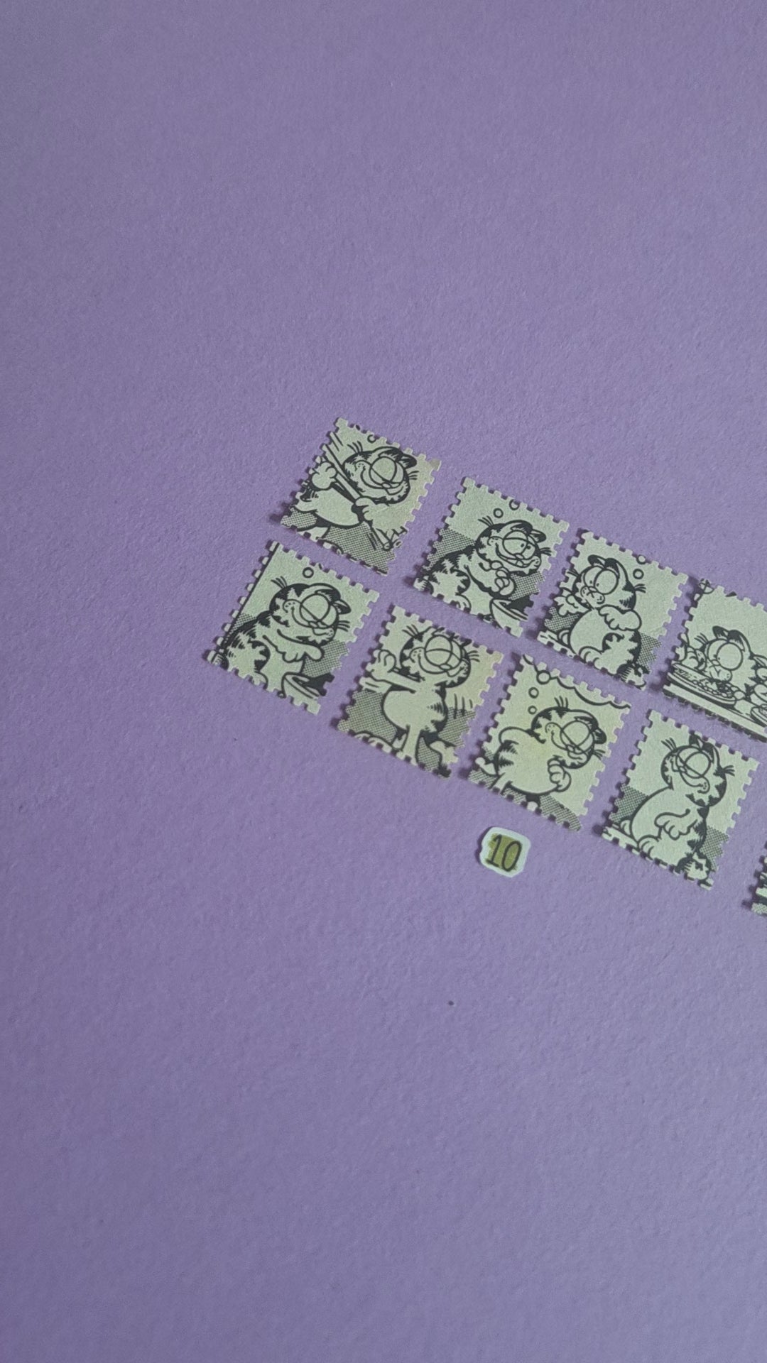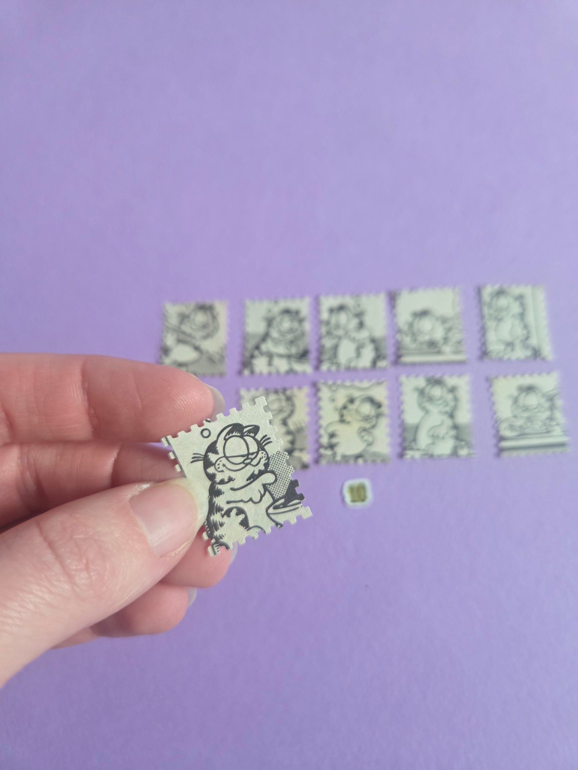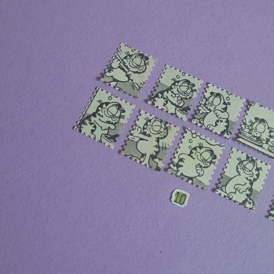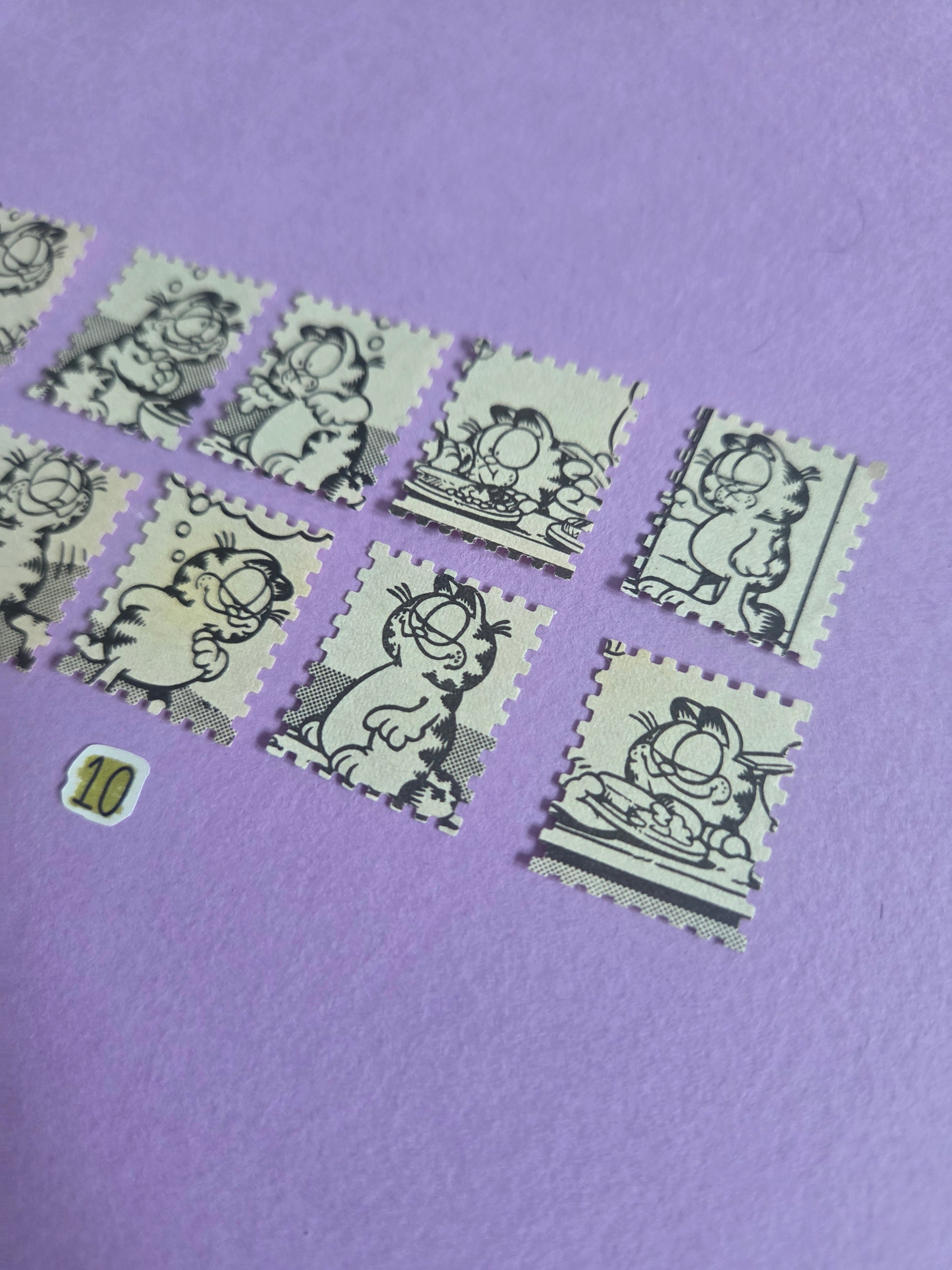 Each piece features classic black-and-white Garfield comic illustrations, trimmed into a stamp-style edge that’s perfect for adding character, nostalgia and a playful touch to your junk journal, scrapbook, art journal or happy mail.