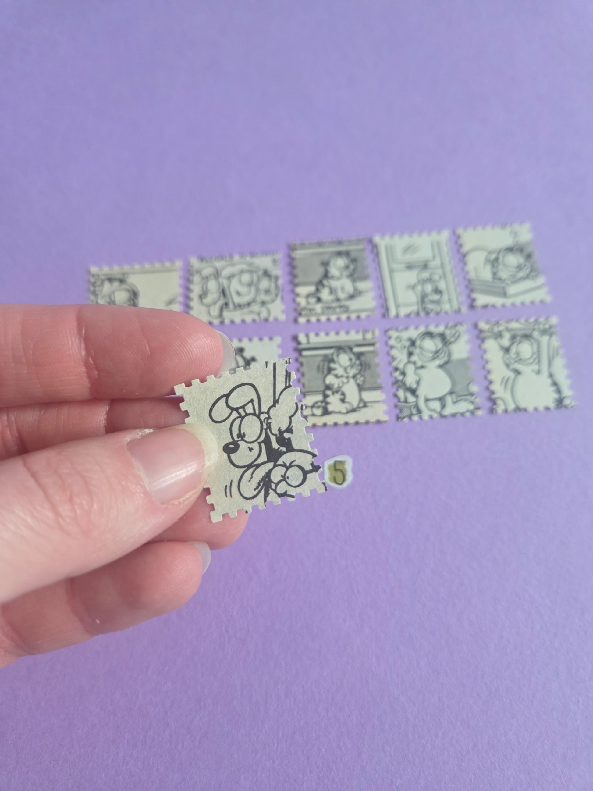 Each piece features classic black-and-white Garfield comic illustrations, trimmed into a stamp-style edge that’s perfect for adding character, nostalgia and a playful touch to your junk journal, scrapbook, art journal or happy mail.