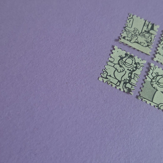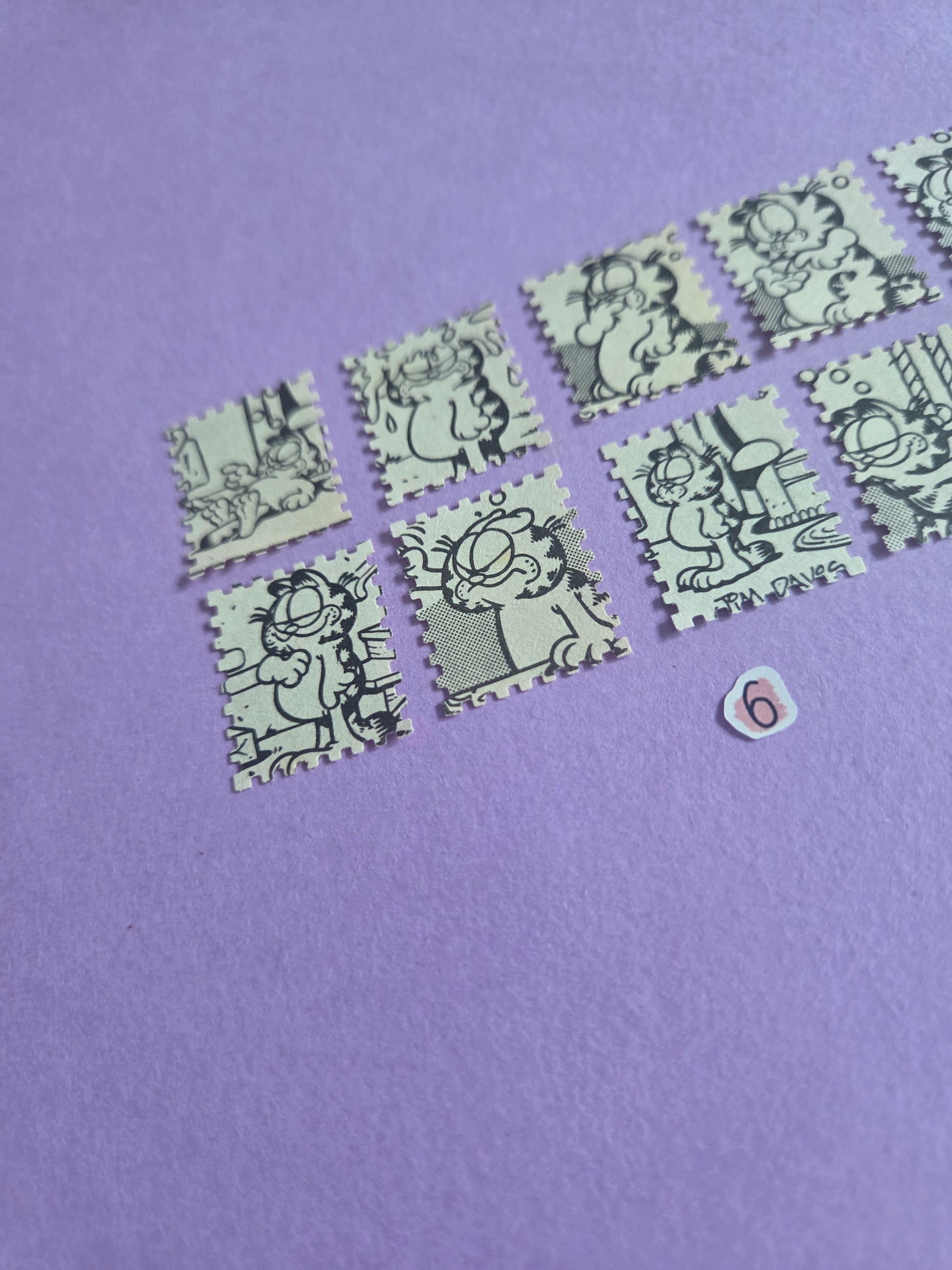 Each piece features classic black-and-white Garfield comic illustrations, trimmed into a stamp-style edge that’s perfect for adding character, nostalgia and a playful touch to your junk journal, scrapbook, art journal or happy mail.
